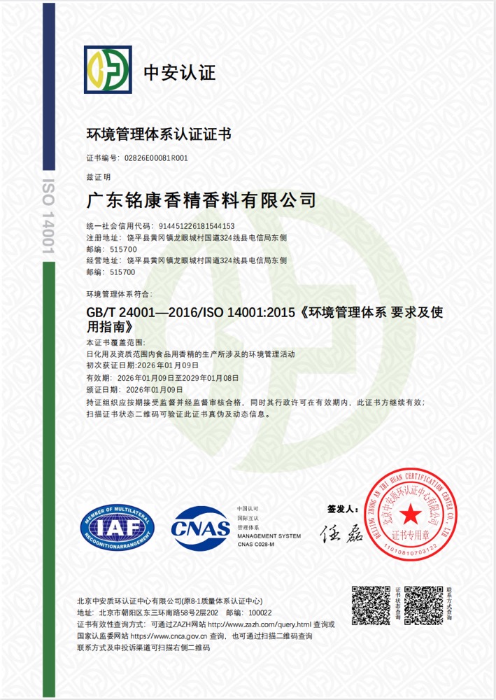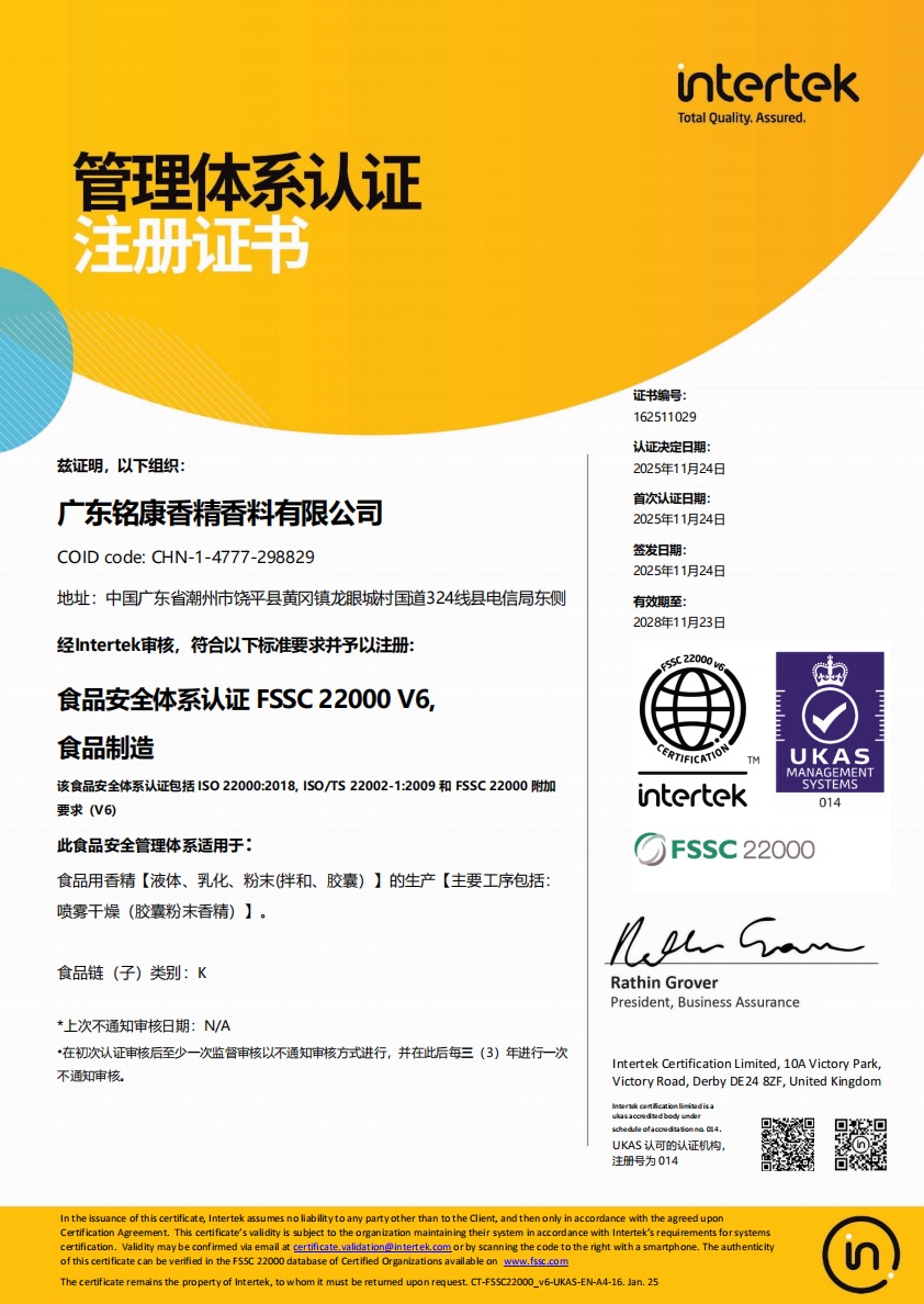 多年來(lái),銘康本著“科學(xué)發(fā)展、追求卓越”的企業(yè)宗旨,秉承“攜手共進(jìn)、誠(chéng)信共贏”的經(jīng)營(yíng)理念,歷經(jīng)二十余載的不懈努力,已發(fā)展成為在中國(guó)香料香精行業(yè)知名度高、創(chuàng)新能力強(qiáng)、影響力大的品牌企業(yè),歷任“中國(guó)香精香料化妝品工業(yè)協(xié)會(huì)副理事長(zhǎng)單位”、“香精專業(yè)委員會(huì)副主任委員單位”、“香料香精法規(guī)事務(wù)工作委員會(huì)副主任單位”、“科技工作委員會(huì)副主任委員單位”,是國(guó)家標(biāo)準(zhǔn)《日用香精GB/T22731-2017》主要起草單位,連續(xù)多年被評(píng)為中國(guó)香精香料行業(yè)十強(qiáng)企業(yè)。